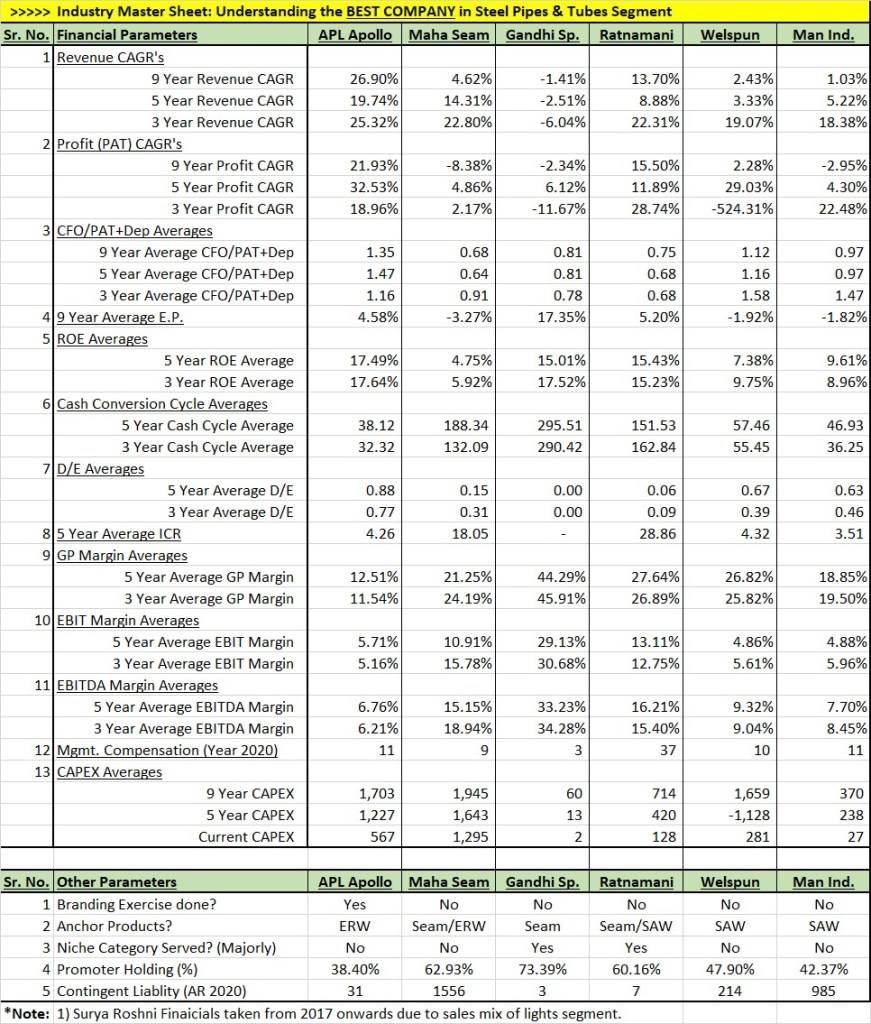 For that purpose, I have prepared a master sheet of whole industry summarising important matrix of all the companies in our segment. Have a look at the extensive data: