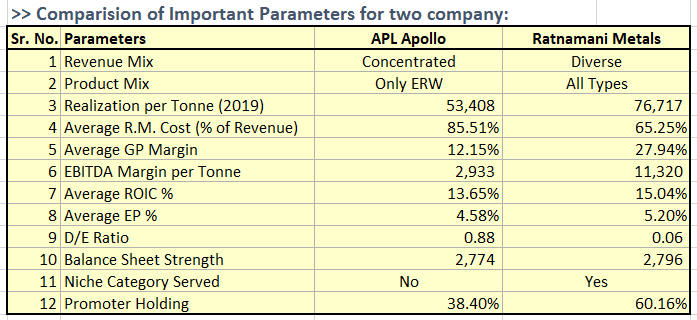 Let us start with Revenue Part. Revenue Streams, when analysed minutely have varied difference. Oil & Gas, Aerospace, Fertilizer, Power, Petrochemicals, E&P, etc. are all source of revenue generation for Ratnamani when compared with Infrastructure, Commercial & Residential Construction activity for APL Apollo. Also, Ratnamani Metals venture into making all types of Pipes & Tubes used for very critical applications serving into niche market compared with only ERW Segment for APL Apollo. Hence, on revenue front, Ratnamani Metals risk is more diversified to many industries and variety of products when compared with almost single stream of APL Apollo Pipes.