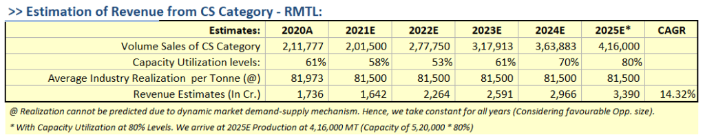 Hence, taking capacity utilization at 80% for Carbon Steel Category with average realization at Rs. 81,500/- per tonne, we arrive at estimated revenue for RMTL for carbon steel category as: