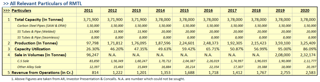 Capacity standing as of year 2020 is 3, 50,000 tonnes for Carbon Steel and 20,000 tonnes for Other Alloy Materials. Going forward, company is coming up with new capacity for Seamless Plant as well as de-bottlenecking in its existing CS Plants. Due to lockdown and travel restriction, company expects plant to be operational only from Q3FY 2021 as opposed to earlier date of May, 2020. Have a look at the capacities (current and proposed) for RMTL: