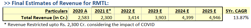 Hence, for determining Revenue of RMTL till 2025, we have considered both the product categories. We would simply combine both the revenues to get RMTL’s total revenue. Note that, for the year 2021, the figures have been adjusted to reflect the impact of COVID on revenue of the company (as indicated by management at Rs. 2,300/- Crores.).