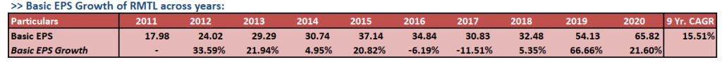 We see huge growth story for RMTL. Its EPS have very high growth CAGR of 15.51% from 2011 till 2020. This has added to shareholders value and shareholders are rewarded with high stock returns.