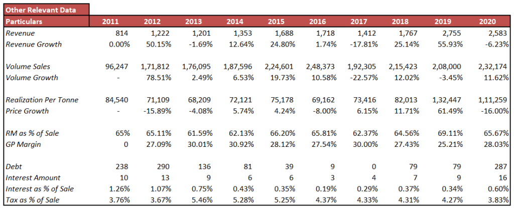 What we see that over the years, Only Volumes Sale have been consistently on rise. As said, pricing (i.e. Realizations), is not consistent and hence not in company’s control. For Operating Leverage we already analysed Raw Material as % of Revenue over the years (industry analysis), where we understood that the rise/fall in R.M prices are not passed on to clients and borne by company itself. Hence, the advantage of operating leverage is volatile and depends on raw material pricing. Financial Leverage impact is very limited and in case of RMTL, the advantage only exists when debt funding is higher leading to better capital allocations.