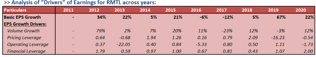 Hence, in a nutshell, Volume Growth is most stable, reliable and major driver of earnings growth. Whereas, the advantages coming from Pricing Growth, Operating Leverage (RM Costing) and Financial Leverage (when debt level are reasonable) are not so consistent and depends on uncontrollable factors like demand-supply for Raw Materials and Finished Goods Pricing.