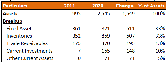 When we compare the change in Assets of the company from 2011 to 2020, Rs. 1549/- Crores have been added. Have a look at what line items contributed these assets rise: