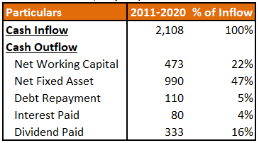 Similar to balance sheet fund flow analysis, this part is quite clear. The management have got majority of their inflows from very good source i.e. core business and utilized amounts for expansion, debt repayment and distribution to shareholders. Have a look at the simple Cash inflow and outflow chart: