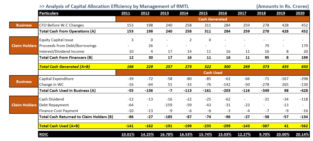 The above is one, very simple table to explain you the Capital Allocation skills of management. From the above, we see that about 90%+ of the Cash have come from the core operations i.e. business. Also, from the above we could also see that majority of money is employed for CAPEX Expansion. The balance part is still blocked in business in form of Change in Working Capital. Apart from the Cash Usages, the balance part is used for claim holders of business only.