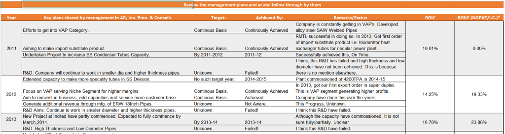 This is the most important aspect and forms core part of management analysis. Strike Rate is simply the number of promises fulfilled by management w.r.t. total promises given. We often hear management giving guidance regarding future plans, future achievable growth rates, etc. Through this analysis, we will get a probable future estimation of whether the management ambitions regarding future plants will be executed or not. This part is done through a simple yet very useful analysis which you will find on excel sheet, snapshot of which is: