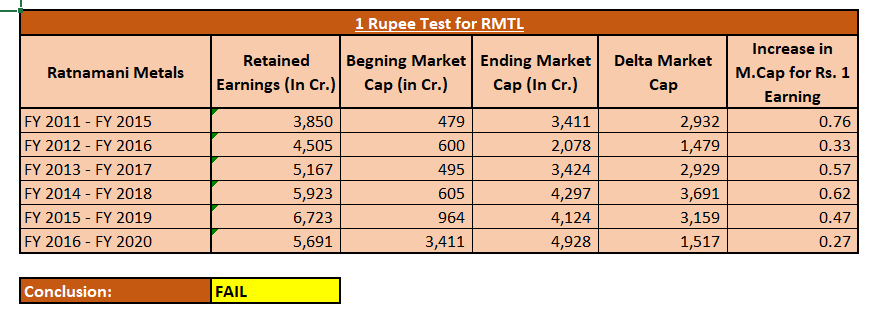 Rs. 1 test is an exercise conducted to understand how much market cap have increased for every Rs. 1 of addition in retained earnings. This analysis is done over the years on rolling basis as below: