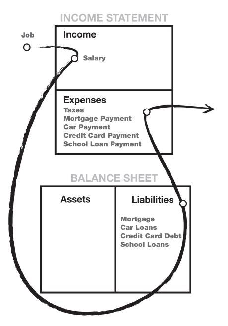 Middle Man: He has better income from his salary (inflow). But in the desire to have better amenities for himself he has taken Home and Car on loan. We can see this as his income is used up to pay liabilities and expenses (outflow). Liabilities like mortgage payment, car loan, school loan and expenses like tax payment, food, clothing, light bill and other necessaries.