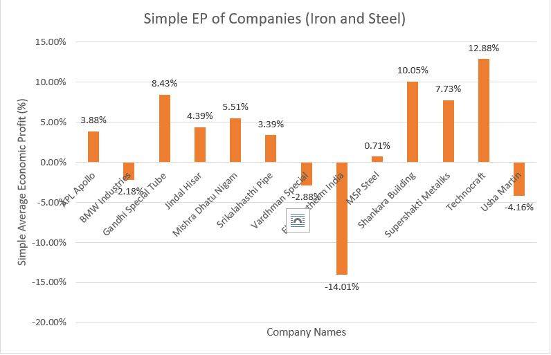 A chart representation of companies Simple Average E.P of Iron and Steel Industries.