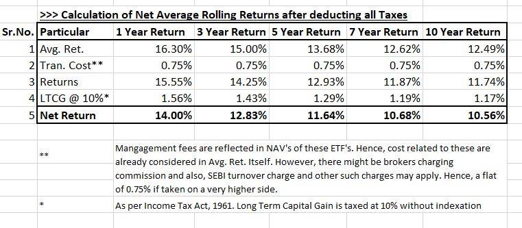 I dive in a bit further deep, and tried to adjust this 12.50% average returns for transaction cost and taxes. Because, when business’s ROE is calculated, PAT is considered which is after deducting all the taxes. Hence, another snapshot of Net Average returns after deducting all the costs and taxes: