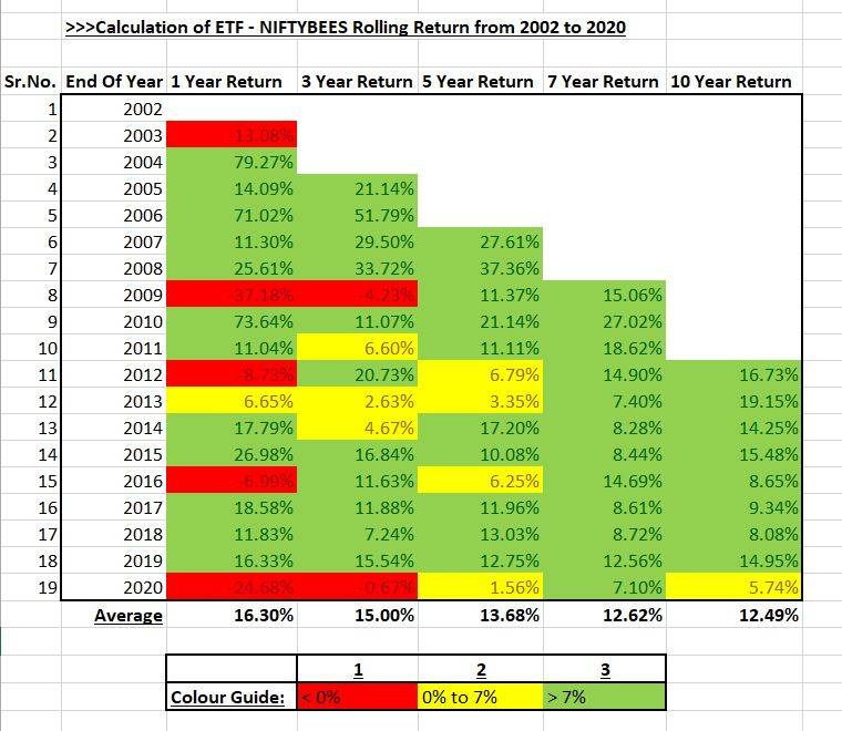NIFTYBEES is trading since Jan 2002, hence returns from inception is calculated. 1 Year Return is Simple Average whereas 3/5/7/10 Years return are CAGR.