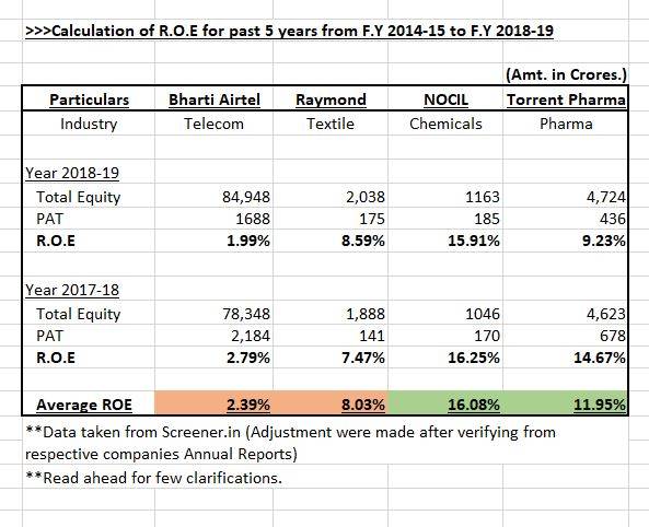 People/Investors might argue the use of this returns ratio which I have considered i.e. ROE. This is my personal opinion to calculate the returns earned by businessman if they were to invest money. Some might take ROCE or even ROIC. My purpose of taking this ratio is to calculate how much % of return an individual will take home on his own money (ROE), and not overall returns earned by the business (ROCE, ROIC). The result of the average returns of past 2 years generated for each companies (namely Bharti Airtel, Raymond, NOCIL and Torrent Pharma) are shown below: